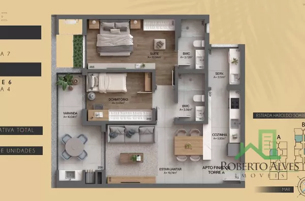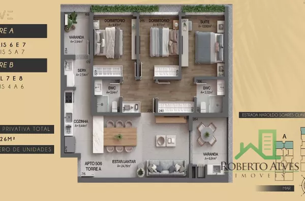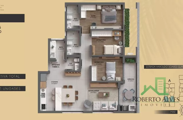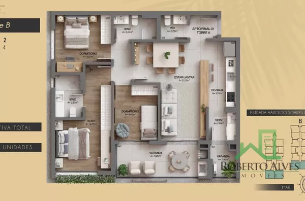 - Porcelanato 90x90cm em sala, cozinha, área de serviço e banheiros