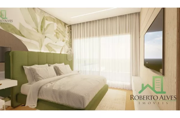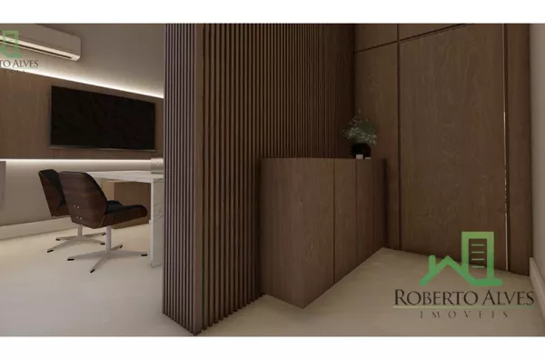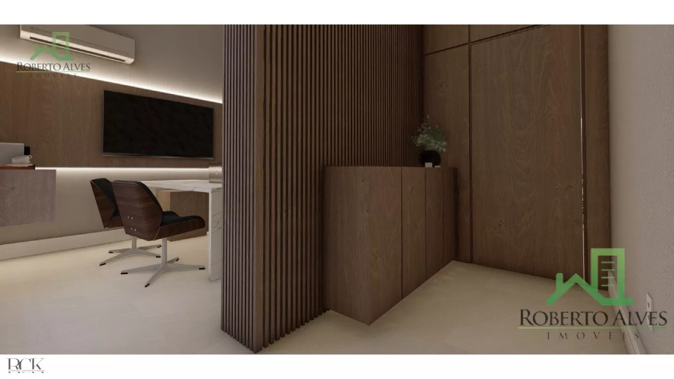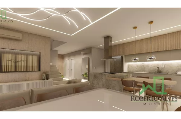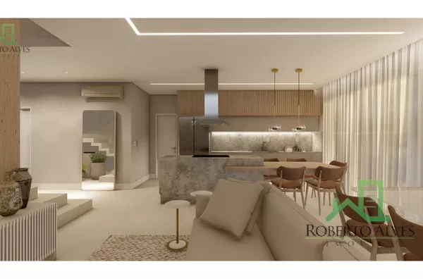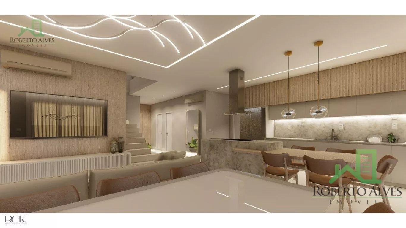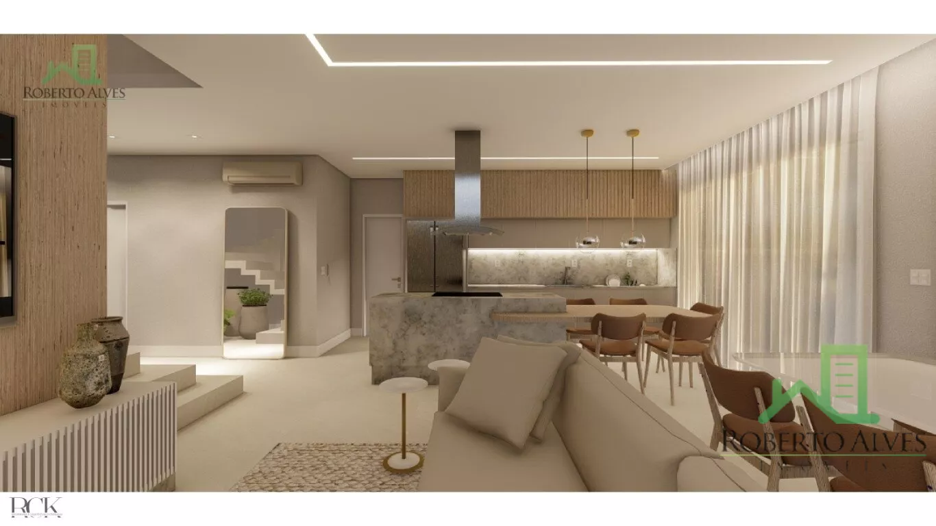 A área social é composta por cozinha, sala de estar e sala de jantar, todos integrados e no mesmo nível.