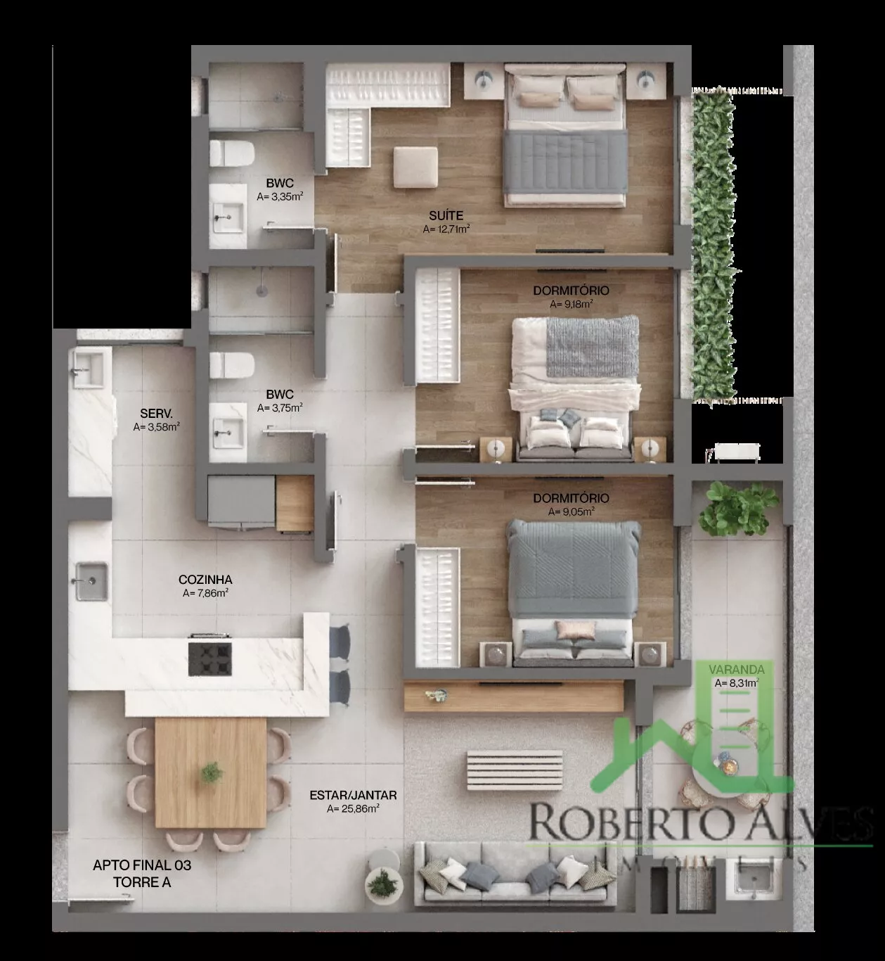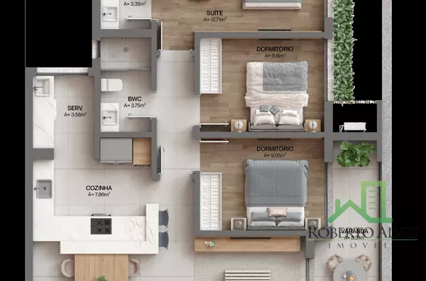 - Porcelanato 90x90cm em sala, cozinha, área de serviço e banheiros