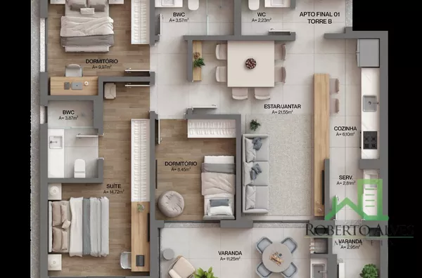 - Porcelanato 90x90cm em sala, cozinha, área de serviço e banheiros